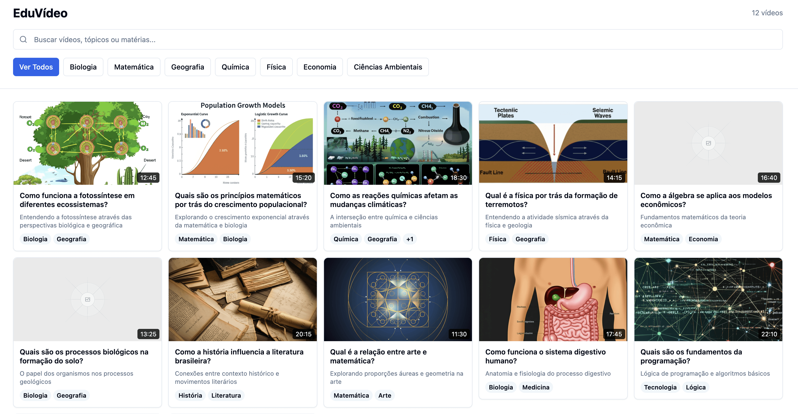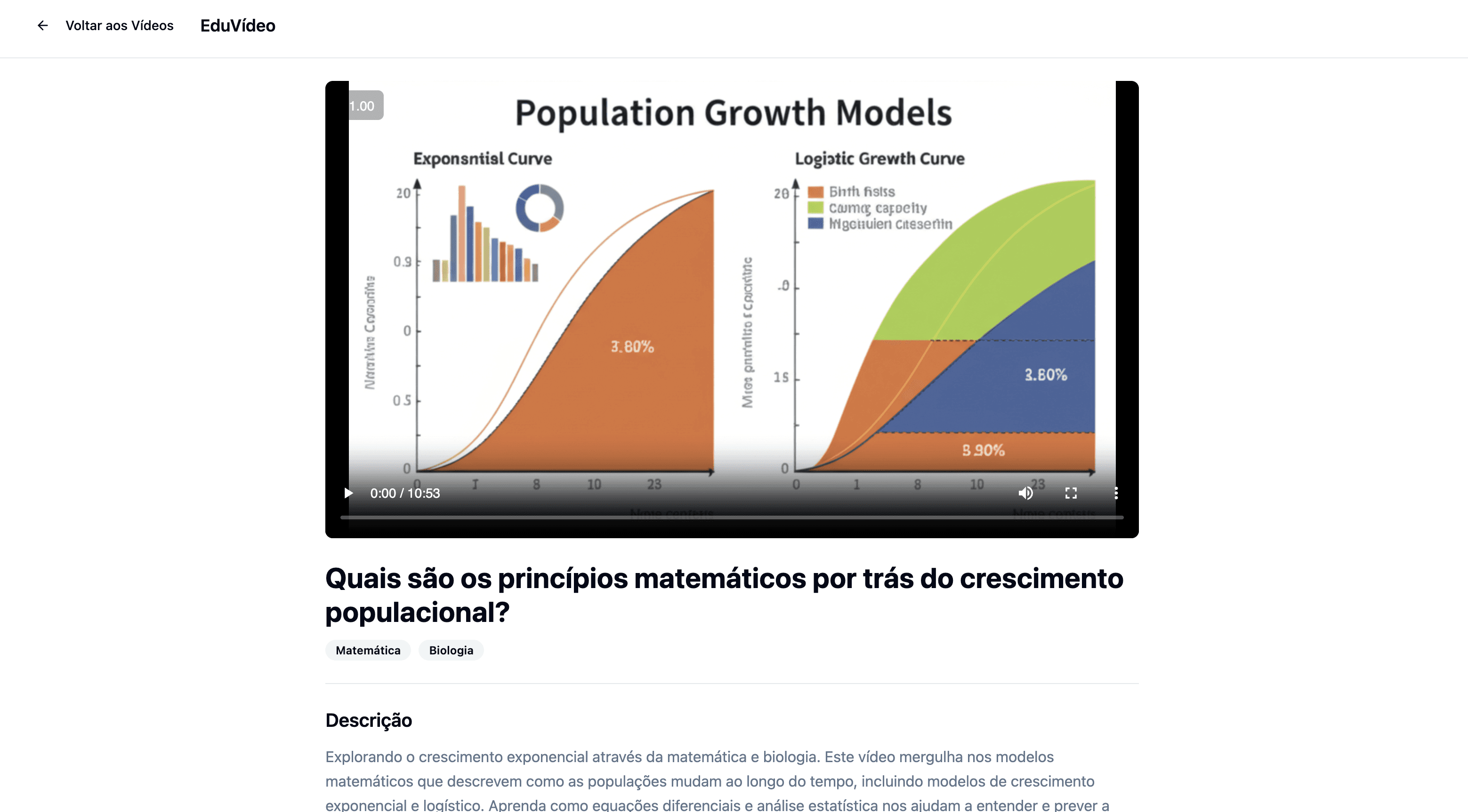 Construí uma PoC funcional usando o v0 e subi direto na Vercel. A interface simulava como a funcionalidade de videoaulas ficaria dentro da experiência da plataforma, incluindo navegação, filtros por matéria, e a tela do player com título e descrição do conteúdo.