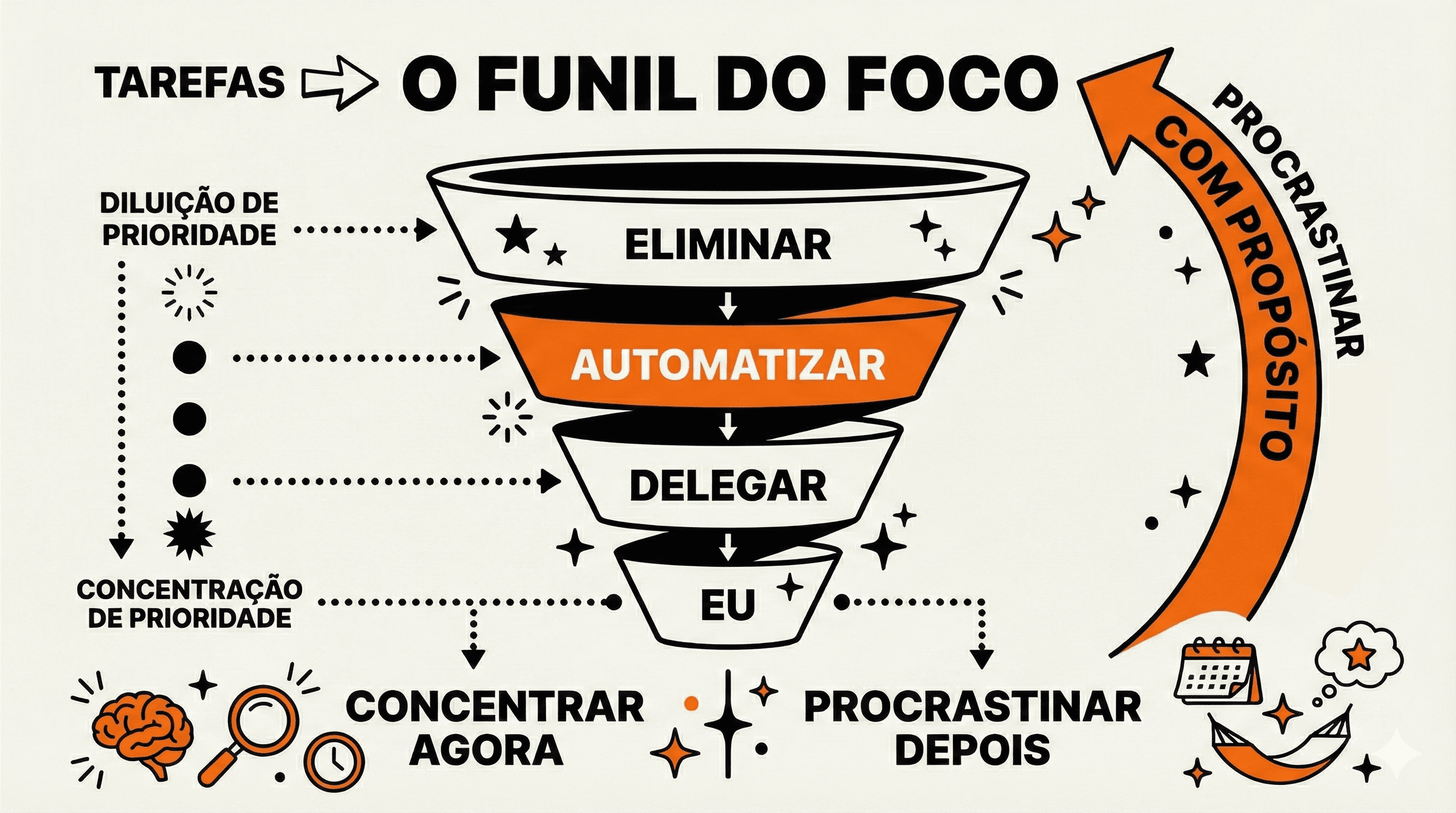 Quando fui apresentado a esse conceito, uma "chavinha" virou na minha mente. A premissa do Focus Funnel, popularizada por Rory Vaden, não é apenas gerenciar o tempo, mas multiplicá-lo. A ideia é que você deve gastar tempo hoje em coisas que criarão mais tempo amanhã,.