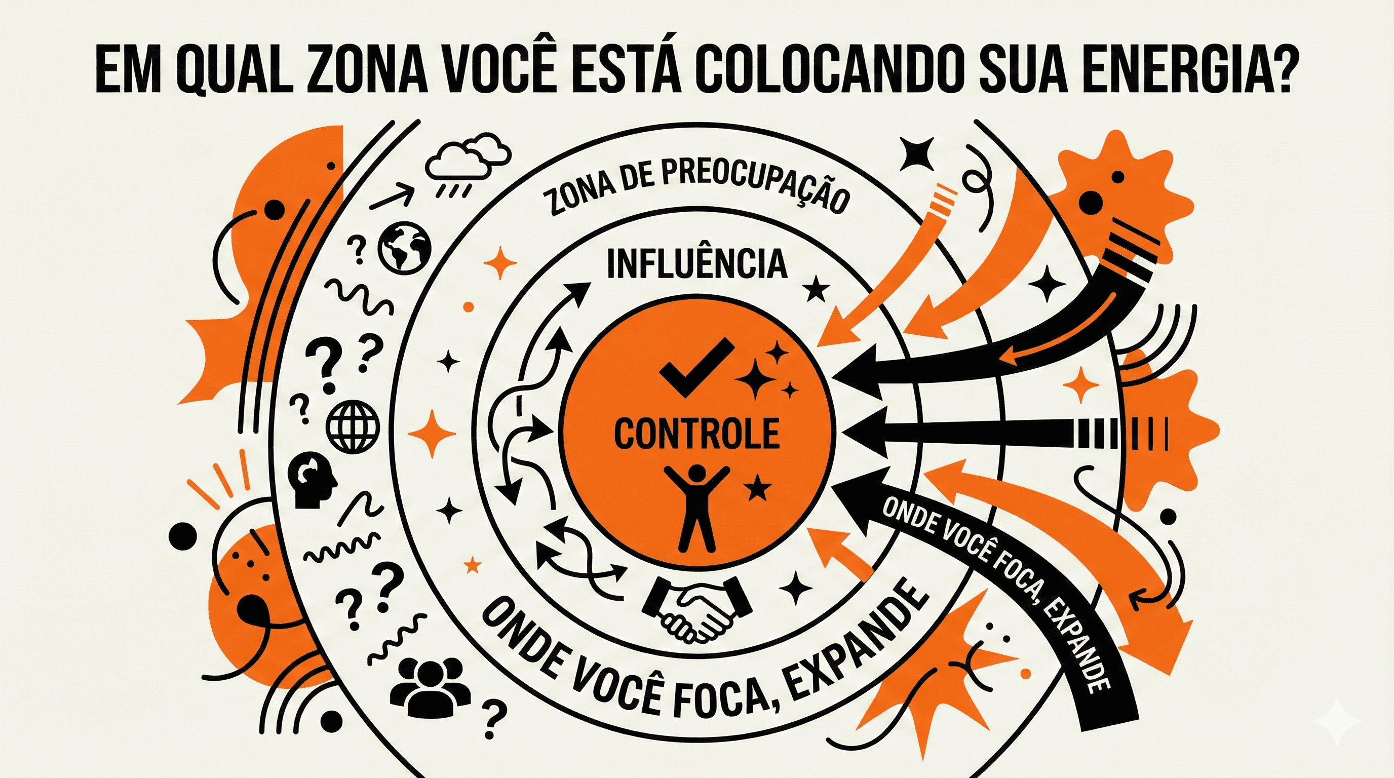 3. Zona de Preocupação: É o terreno do "se". Aqui residem coisas que nos afetam, mas sobre as quais não temos controle algum: a economia global, o clima, as decisões de políticos ou a opinião alheia,. Quando focamos aqui, entramos na "zona do desespero", gerando ansiedade e inércia.